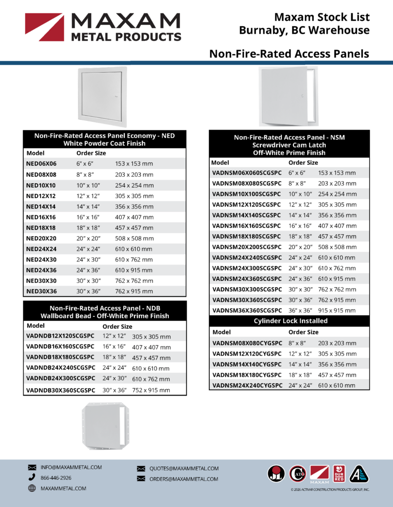 Maxam has committed to investing in a comprehensive selection of stocked products in our Burnaby, BC manufacturing facility. By stocking products locally in the greater Vancouver area, we can help you to get products to your project sooner, and to outperform your competition, with short lead times for many commonly-ordered items. Our centrally-located warehouse provides quick access to our most popular access panel, roof accessory and cover plate models.